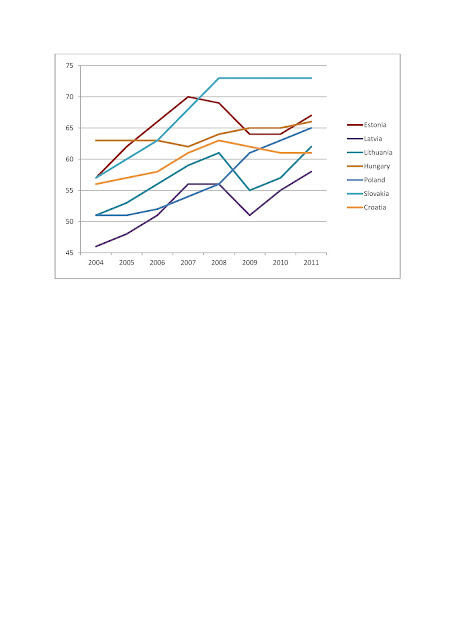 Üks väike graafik selle kohta, kuidas on muutunud Eesti positsioon lähenemisel Euroopa Liidu keskmisele jõukusele. Graafikus on toodud riikide SKP elaniku kohta võrreldes EL keskmisega. Eestil on see 2009 ja 2010 püsinud 64% tasemel. Koos Ansipi valitsusega alustasime tasemelt 66% EL keskmisest koos selliste riikidega nagu Ungari, Slovakkia, Horvaatia. 2010.aastaks on meist Slovakkia pikalt mööda läinud ja samuti on meie ette jäänud Ungari. Väga tihedalt on kannule tulnud Poola. Meiega samal tasemel püsib enam vähem Horvaatia. Viie rikkama hulka jõudmisest on asi ikka väga kaugel, pigem tulevad lähimad konkurendid meile järgi ja Slovakkia näitab tagatulesid.